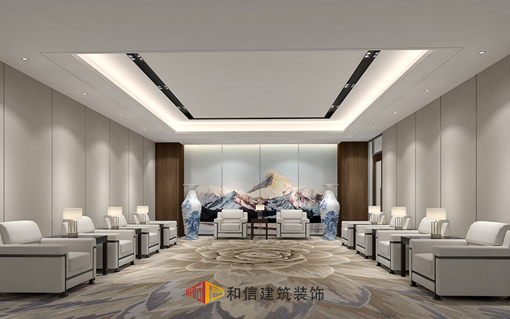 接待區(qū)整個(gè)空間講究左右對稱,主要以白色為主,整個(gè)空間為環(huán)形設(shè)計(jì),方便了大家面對面交流,地面的立體大花和背景的中國山脈裝飾畫相輔相成,形成了獨(dú)特的新中式風(fēng)格,給人帶來全新的視覺體驗(yàn),呈現(xiàn)不一樣的接待氛圍,有一種氣勢宏偉的感覺。給到訪的賓客有溫文儒雅、富而好禮的尊貴感受。
