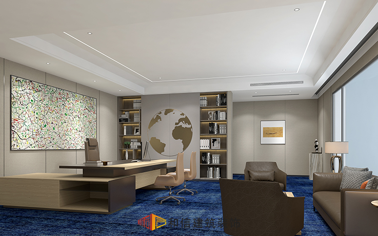 總經(jīng)理辦公室的裝修設(shè)計(jì),直接代表著企業(yè)的形象和實(shí)力,案例中展示的總裁辦公室為新中式風(fēng)格,總裁辦公室既有辦公區(qū)也有接待區(qū),方便了總裁接待客戶,背景墻的裝飾畫和簡約鏤空的世界地圖,給人眼前一亮的視覺沖擊,整排多元收納柜,可以收納不同規(guī)格的商務(wù)文件。