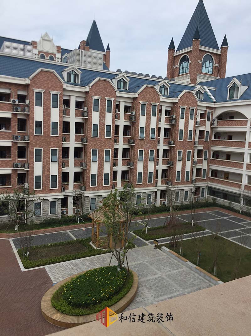 學(xué)校裝修外觀為古典城堡建筑風(fēng)格,錯落有致,色調(diào)搭配和諧、穩(wěn)重的同時冷暖色系比例合適,給人一種積極向上的觀感。室內(nèi)延續(xù)了建筑的色彩搭配,古典精致的吊燈安排在學(xué)生宿舍走廊,希望帶給學(xué)生一種溫暖的歸屬感。