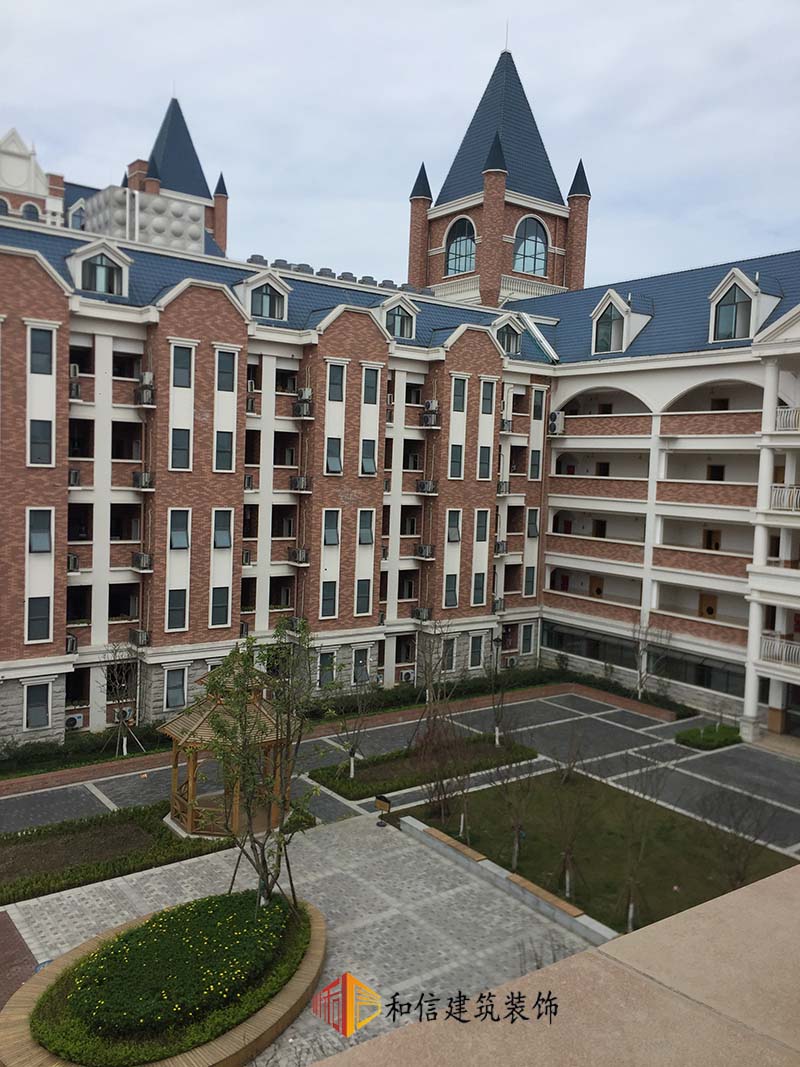 學(xué)校裝修外觀為古典城堡建筑風(fēng)格,錯落有致,色調(diào)搭配和諧、穩(wěn)重的同時冷暖色系比例合適,給人一種積極向上的觀感。室內(nèi)延續(xù)了建筑的色彩搭配,古典精致的吊燈安排在學(xué)生宿舍走廊,希望帶給學(xué)生一種溫暖的歸屬感。